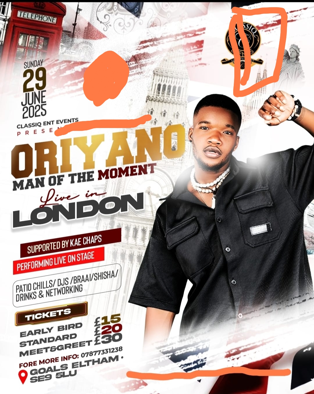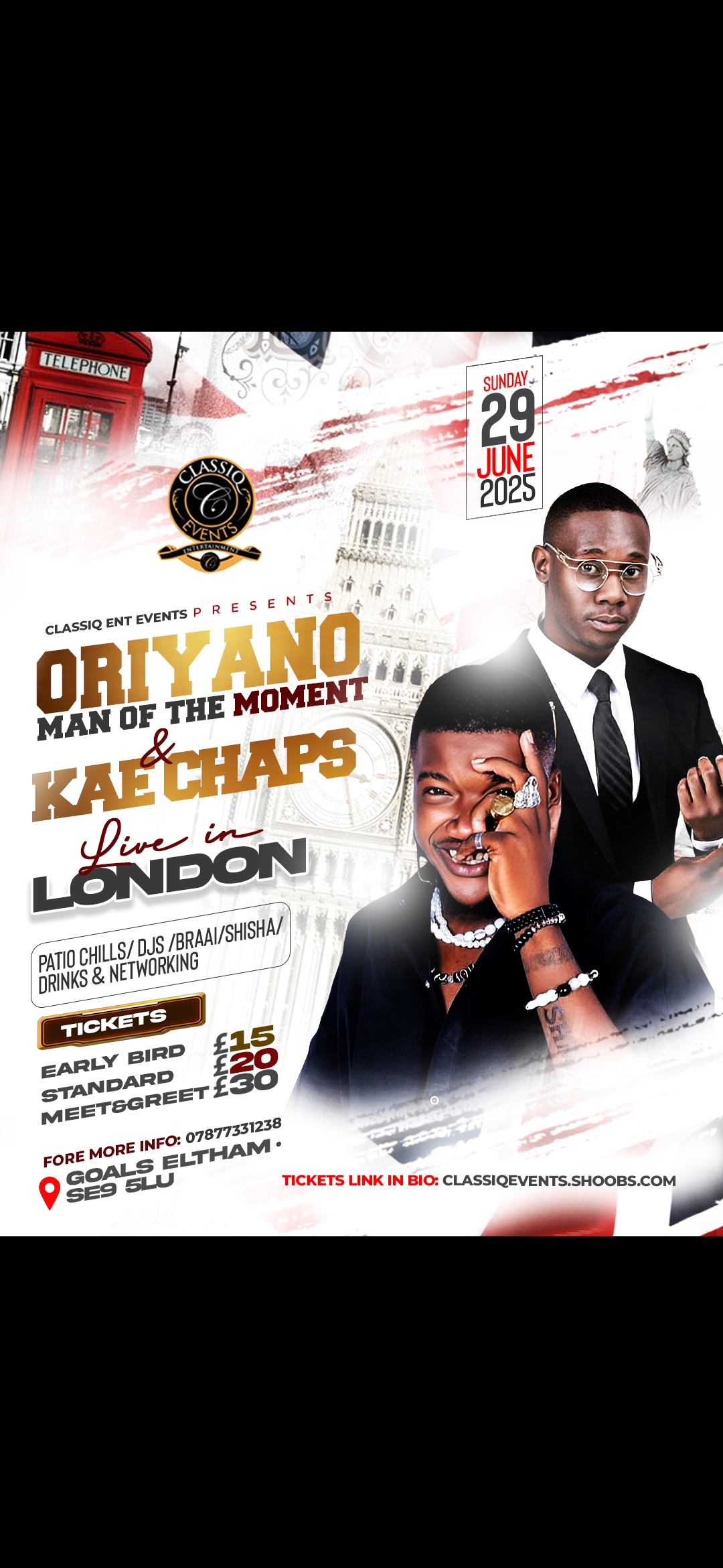 The Magnificent ORIYANO and KAE CHAPS WILL PERFORM LIVE IN LONDON FOR THE 1st Time. Embrace your selves for a mind-blowing performance from the singing maestro's This Event is Suitable for the whole...